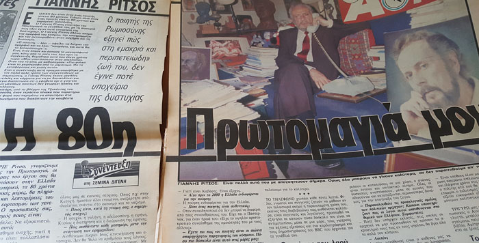 Κατηγορία: ΆρθροΣυντάκτης: Σεμίνα Διγενή"Είδηση δεν είναι όταν ένας ποιητής γίνεται 80 ετών. Είδηση είναι, όταν ένας ποιητής 80 ετών, παραμένει αισιόδοξος". Έτσι ξεκινούσε η συνέντευξη που είχα πάρει μια Πρωτομαγιά του 1989, από τον Γιάννη Ρίτσο.